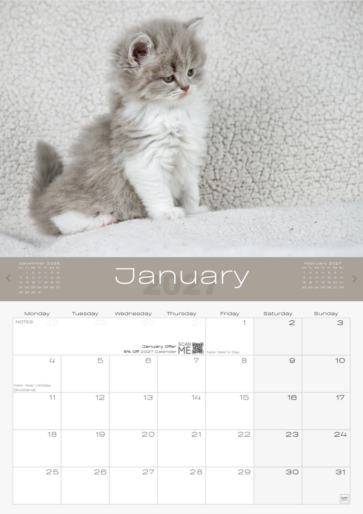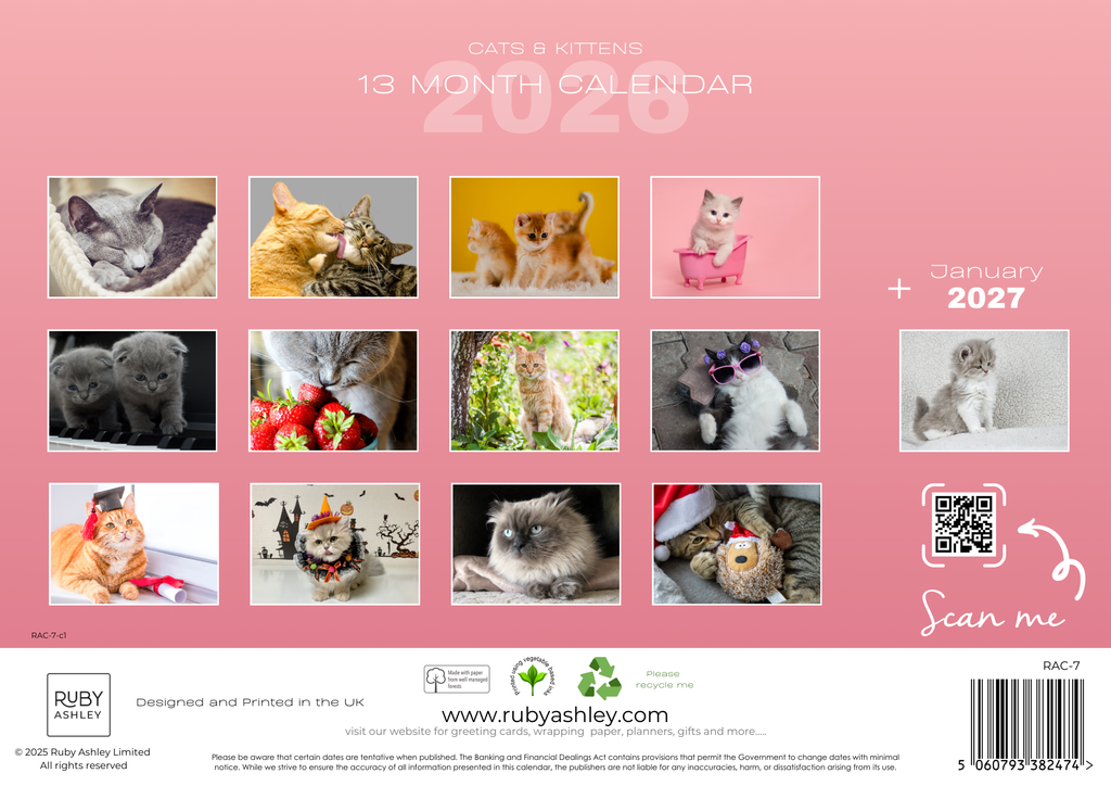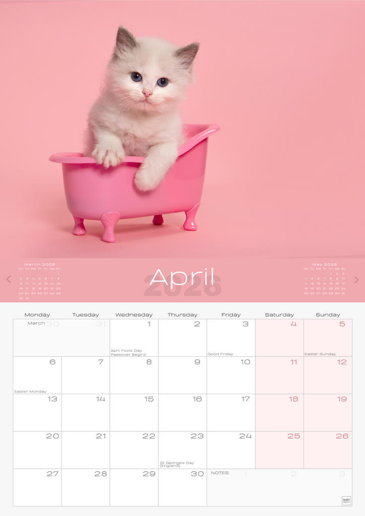 • QUALITY PRINT & PAPER – High-resolution cat and kitten photos printed on premium paper with eco-friendly inks. A durable, recyclable 2026 calendar.