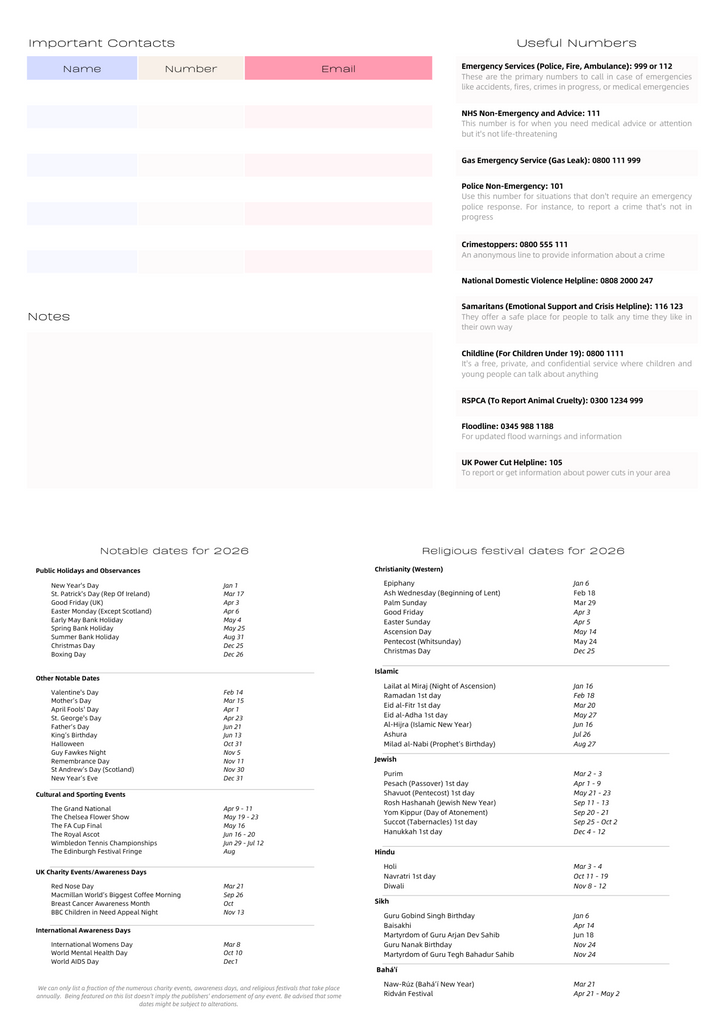 • USEFUL NUMBERS INCLUDED – Handy reference contacts such as Floodline, Gas Emergency, and Samaritans.