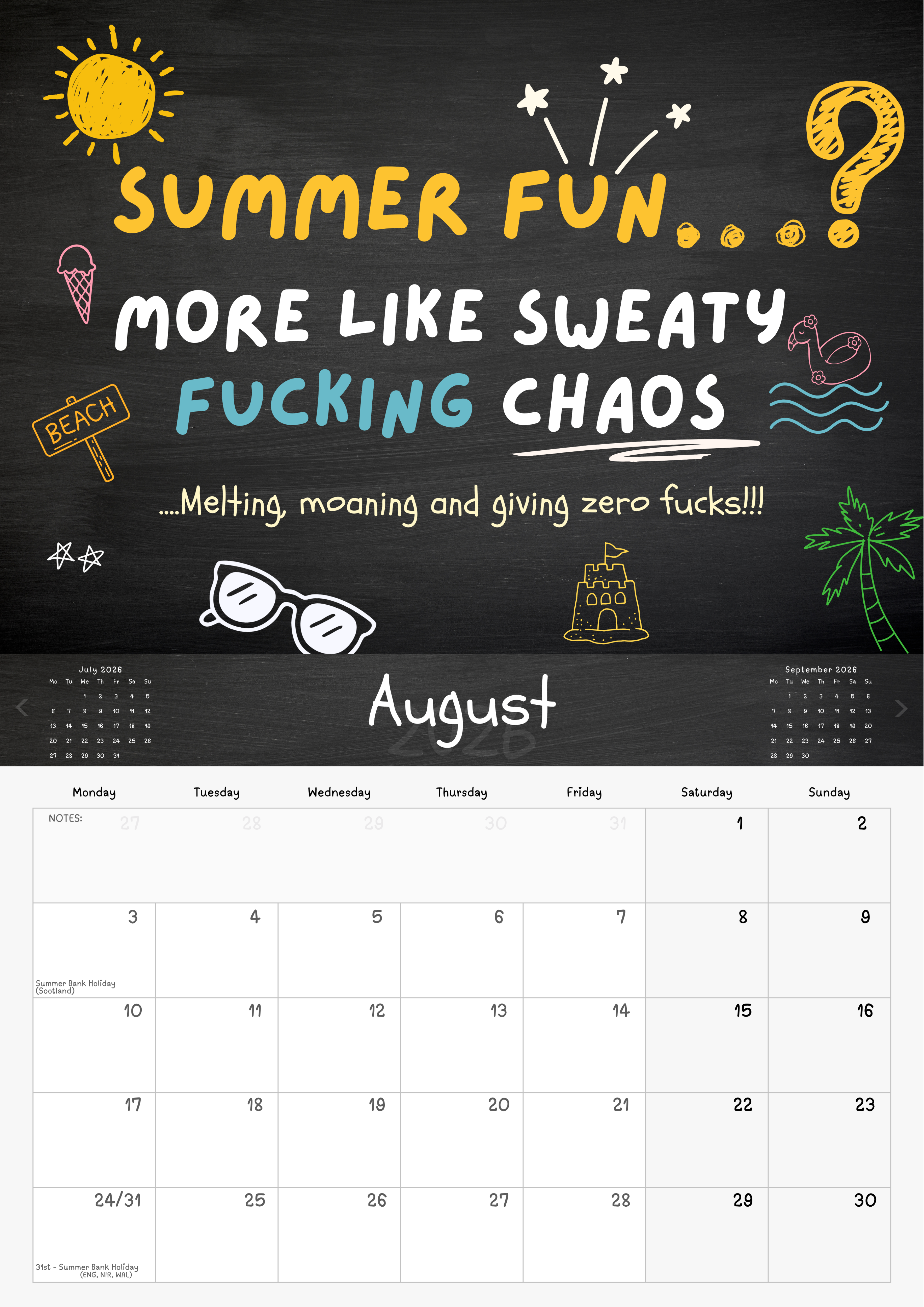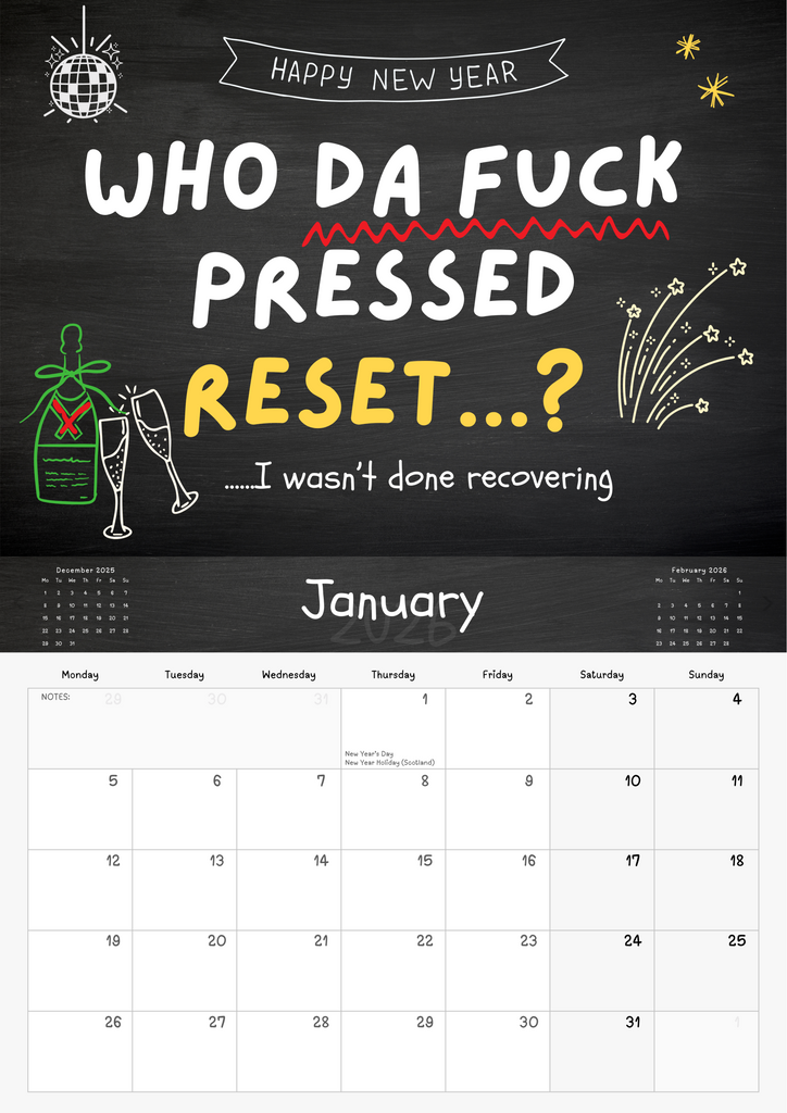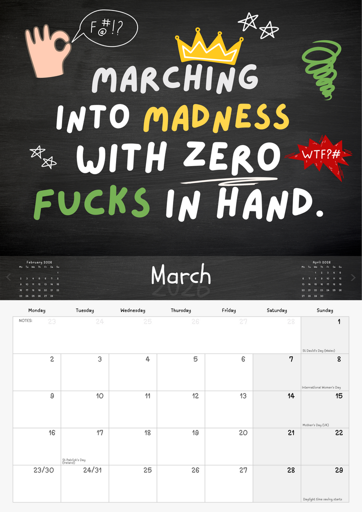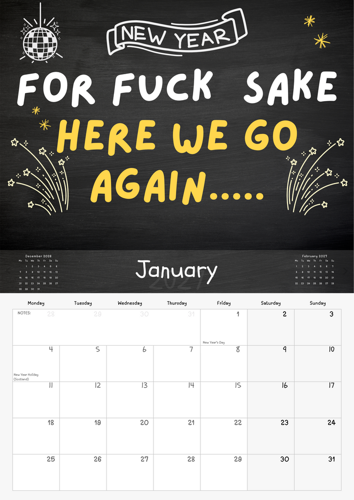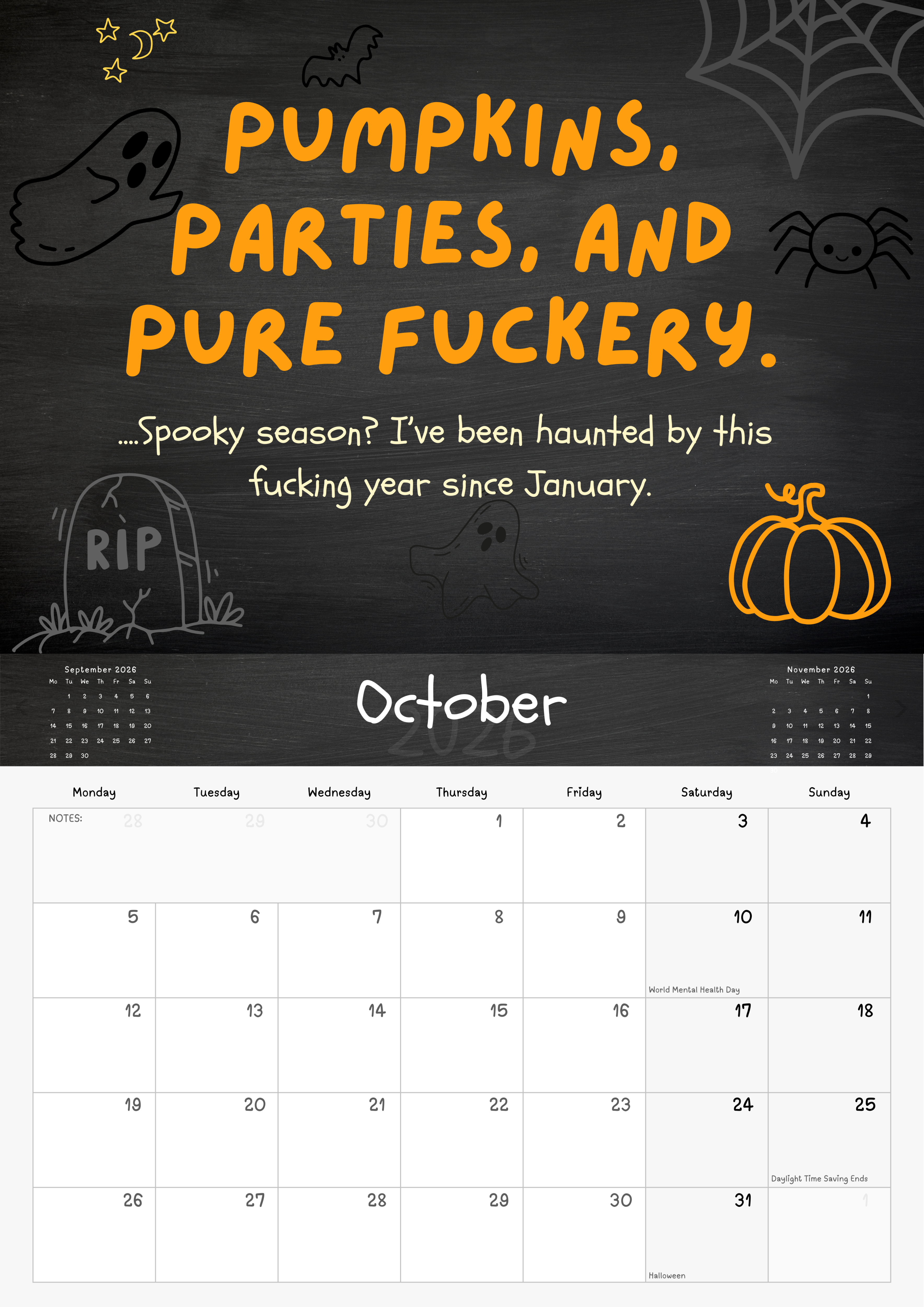 • SPACE FOR NOTES – Ample room for birthdays, appointments, and reminders. Stay organised with a touch of bad language.